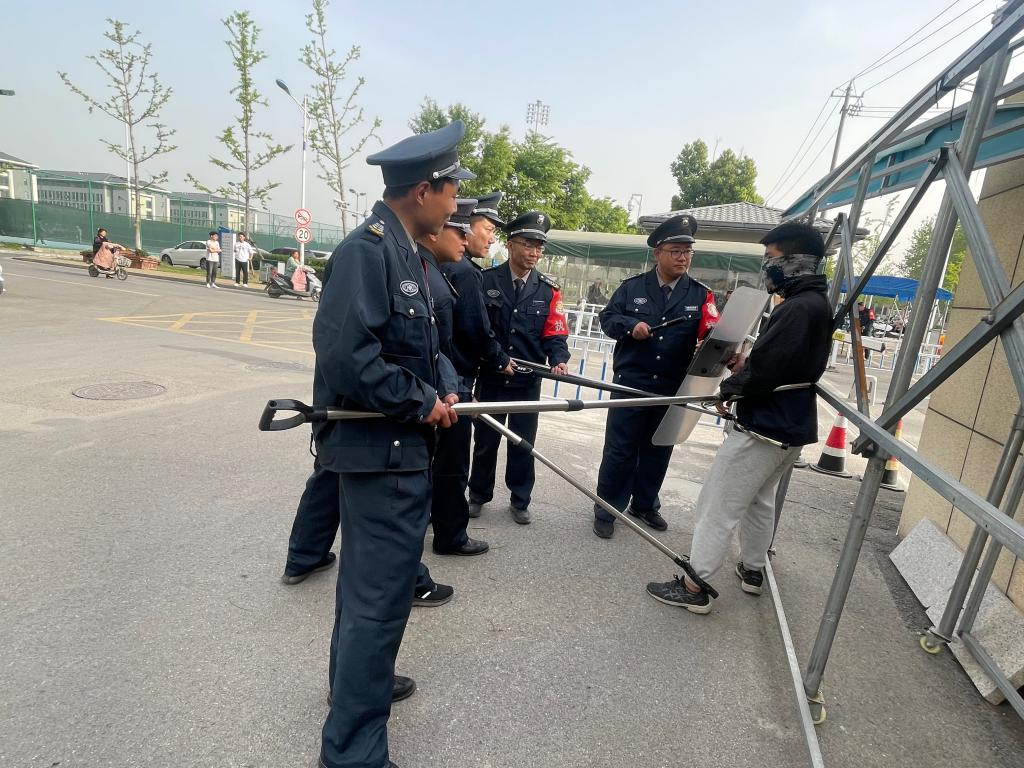 演练前,邵传雷向演练参与人员介绍安保业务知识,对如何使用防暴器械和具体演练步骤等进行业务培训。演练中,戴口罩的“可疑男子”欲进入校园,门卫安保人员在询问过程中,发现其手中持有刀械,要强闯校园。保安队员大声警示:“有暴徒!”,随即启动紧急防暴预案。防护组第一时间到位,使用防暴工具与暴徒形成对峙,阻止其进入校园,并有工作人员立即拨打110报警。安保队员通力合作,及时控制住暴徒,等待民警到来。整个演练过程,学校安保力量配合得力,达到了演练的预期效果。演练后,邵传雷组织防护组成员对本次演练过程中发现的问题进行分析总结,力求在突发事件产生时防护组能以最快、最有效的方式控制局面。