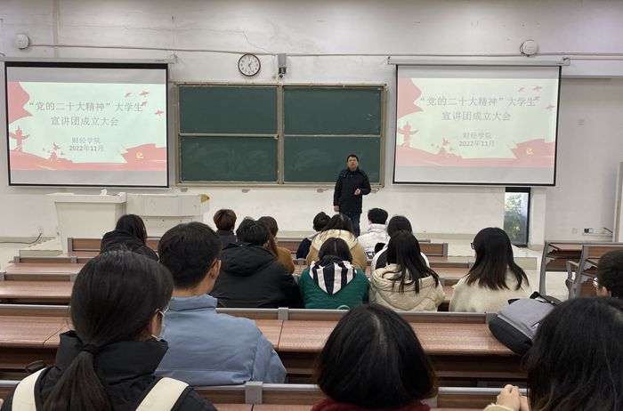 为深入学习贯彻党的二十大精神,有效推动学习活动走深走实,财经学院于2022年11月成立党的二十大精神大学生宣讲团。