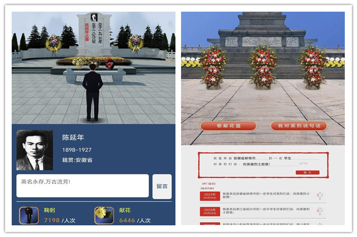 同学们依托“江淮祭英烈”、中华英烈网、网上纪念馆等网络平台或其他新媒体宣传载体,通过“云祭扫”“云留言”等多种方式缅怀英烈,认真学习英烈事迹,发表留言表达自己的感受,抒发对英烈的崇敬之心、感念之情、传承之志。