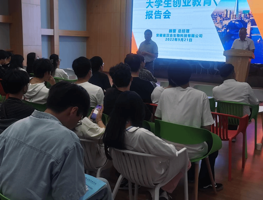 为更好地推动我校创新创业教育工作,增强同学们的创业意识和能力,9月21日下午,教务处 创新创业学院邀请安徽汉合生物科技有限公司总经理、蚌埠市“创业之星”颜雷在龙湖校区众创空间路演厅给同学们做了一场别开生面的创业辅导报告。报告会由教务处副处长、创新创业学院副院长高青海主持,来自龙湖校区六个学院的学生代表和众创空间2022年入驻团队所有成员100余名学生聆听报告。