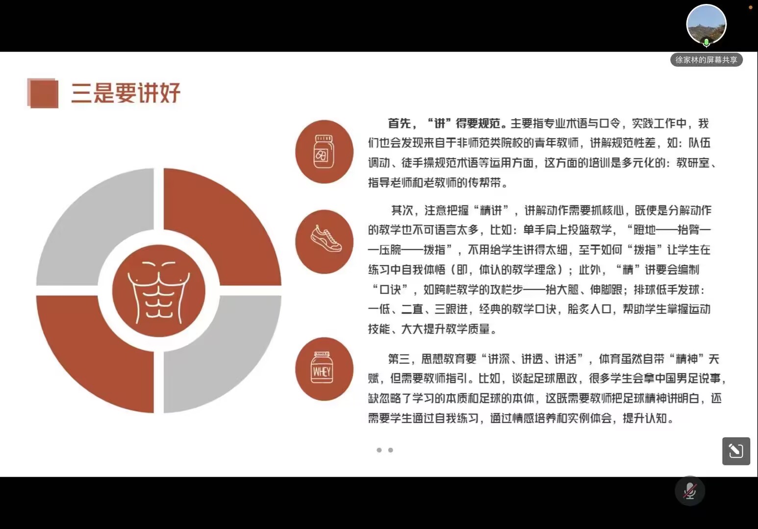 根据会议安排,校教学督导员于敏老师从教学设计,教学方法,思政课融入等方面分享了自己宝贵的教学经验;体育教学部督导组组长徐家林老师从备课、教学组织、讲好、练好、总结好等五方面,分享了如何上好一节精彩的体育课。