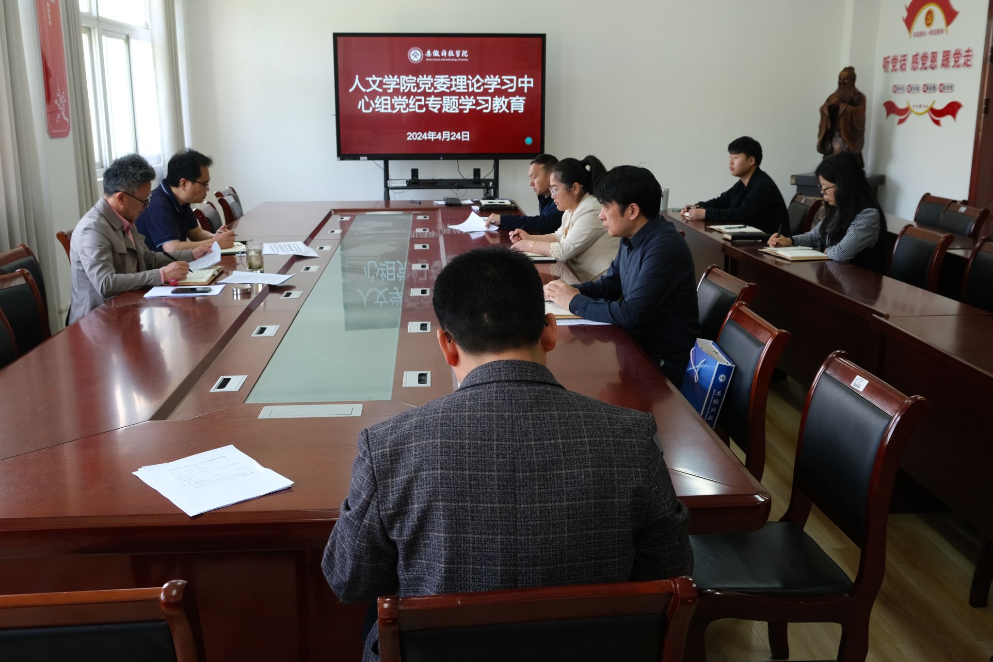 根据学校党委关于开展党纪学习教育的总体部署和人文学院党委《关于组织全体党员集中研读<中国共产党纪律处分条例>条文的通知》,4月24日上午,人文学院党委理论学习中心组召开党纪学习教育专题学习交流会(第一专题),学院党政班子成员、各党支部书记、党政办公室和分团委负责人、工会主席参加,会议由党委副书记、院长李晓东主持。