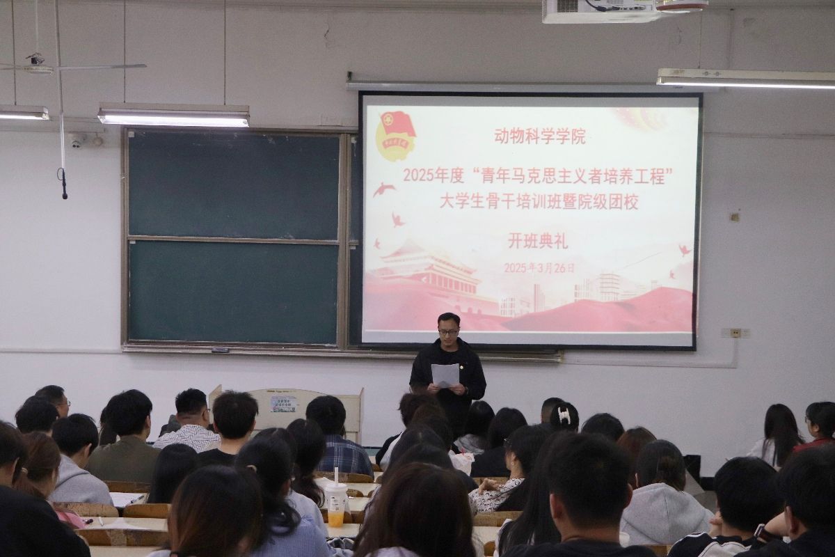 为深入贯彻落实习近平新时代中国特色社会主义思想和党的二十大和二十届二中、三中全会精神和习近平总书记关于青年工作的重要思想,3月26日下午,动物科学学院在求知楼A101举行2025年度“青年马克思主义者培养工程”大学生骨干培训班暨院级团校开班典礼,学院党委书记甘宗平出席并讲授“开班第一课”,党委副书记汤帅,全体辅导员和来自各班级、学生组织主要学生干部参加仪式。仪式由辅导员刘成义主持。