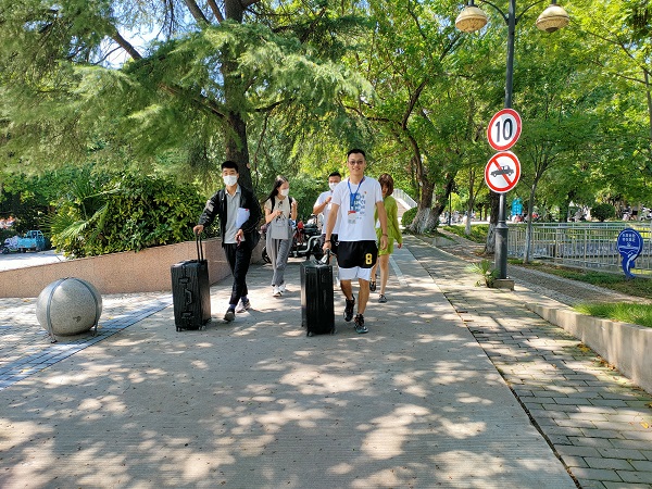 在迎新现场,研究生党员们佩戴党员徽章,奔走在迎新的第一线。党员们带领新生参加疫情检测,引导新生到学院的报到点,帮助新生搬运行李,介绍学校的环境及学习情况,协助他们尽快了解和适应学校环境。