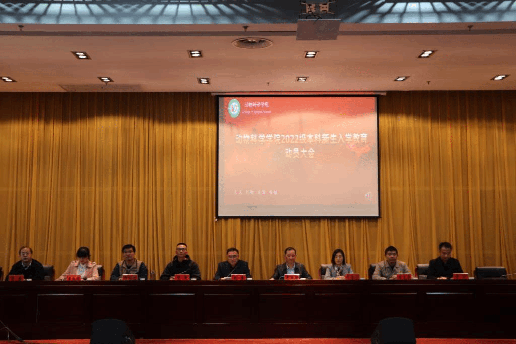 10月12日下午,动物科学学院在校会议中心二楼报告厅召开2022级本科新生入学教育动员大会。学院党委书记姚勇,院长范红结,党委副书记、纪委书记汤帅,副院长华金玲,党委委员、副院长贺绍君,动物医学系主任李文超,动物科学系主任王淑娟,基础兽医学教研室主任李磊,党政办公室主任、团委书记李焱出席会议,新生辅导员及2022级全体本科新生参加会议。大会由姚勇主持。
