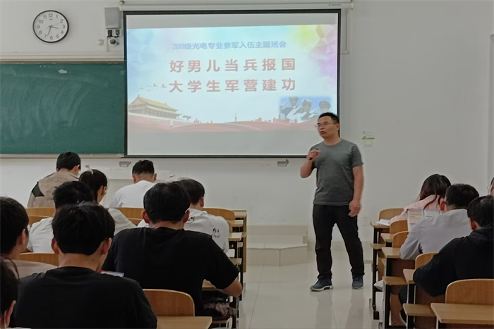 各毕业班分别以“投笔从戎,绽放青春”、“好男儿当兵报国,大学生军营建功”为题召开主题班会。发放“大学生应征入伍‘明白卡’”,以音视频等多种形式分享了学院近几年毕业生在军营的亲身感受,让学生对军营有了更加直观的认识。会后,毕业班辅导员深入宿舍与毕业生深度交流,引导学生参军入伍,坚定献身国防的理想信念。