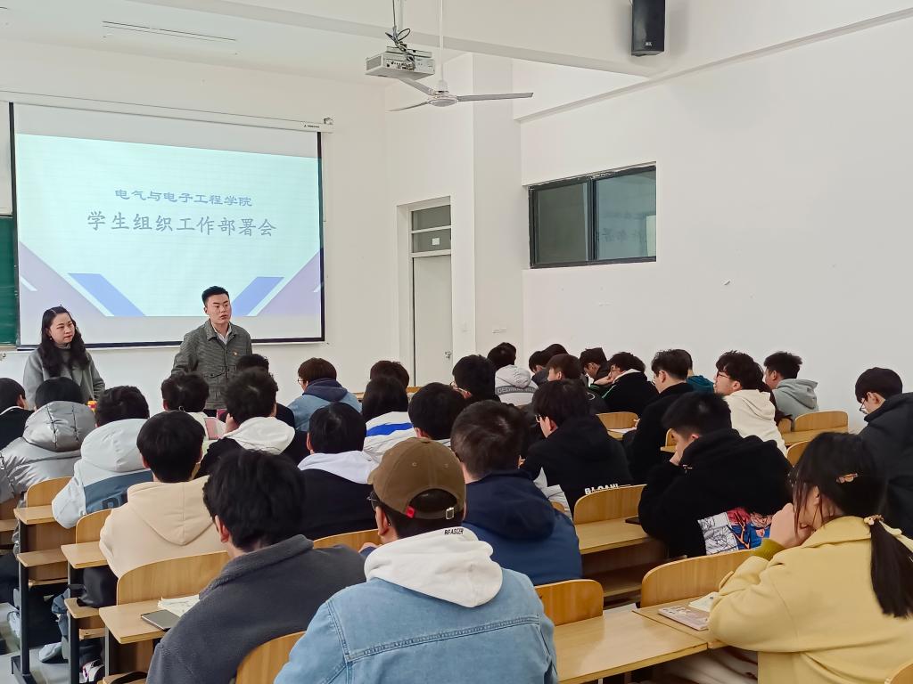3月2日,电气与电子工程学院于致知楼A108召开了电气与电子工程学院学生工作部署会。学院团委书记张成孜,团委副书记、学生会指导教师于宏亮及全体学生组织干部参加会议,会议由孙欣然主持。