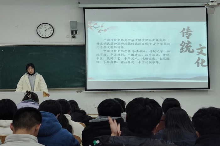 会议开始,陈烁彤首先点明中国传统文化是由中华文明演化而汇集成的一种反映民族特质和风貌的民族文化,具有鲜明民族特色的、历史悠久的、内涵博大精深的、传统优良的文化,并通过介绍中国传统节日的特色习俗、传统艺术以及传统手工艺作品,生动展现了独具特色、博大精深的中华文化。同时,陈烁彤介绍了中国传统文化的强大影响力,提出传承弘扬中华优秀传统文化,是推进社会主义文化强国建设、提高国家文化软实力的重要内容。最后陈烁彤呼吁:作为新时代青年,要不断增强对中华优秀传统文化的认同感,继承和弘扬优秀传统文化,增强中华优秀传统文化的生命力和影响力,铸就中华文化新辉煌。