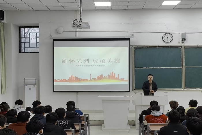 4月4日晚,电气与电子工程学院团委于致知楼C111召开清明节“缅怀先烈、致敬英雄”主题团课。学院团委书记张成孜,团委副书记、学生会指导老师于宏亮及全体学生组织干部参加此次团课。
