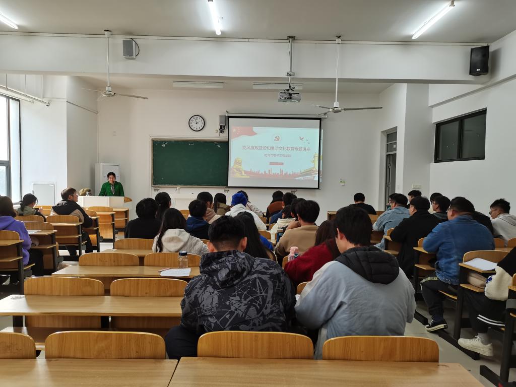 11月26日,电气与电子工程学院于致知楼C205开展党风廉政建设和廉洁文化教育专题讲座,学院纪律检查委员会委员汪婵,光电建电专业学生党支部书记张深,及光电建电专业学生党支部全体党员参加讲座。