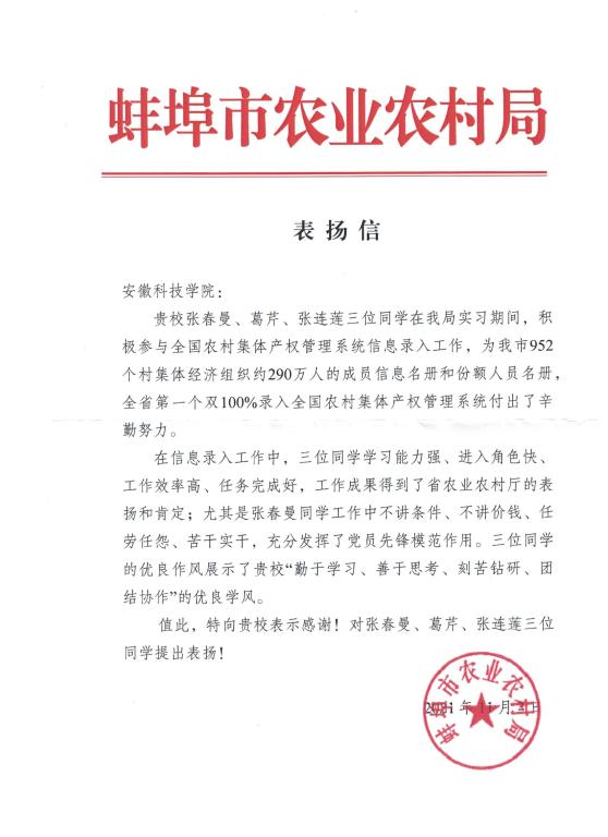 近日,一封来自蚌埠市农业农村局的表扬信寄到了我校管理学院,信中对管理学院研究生支部党员和积极分子2020级农业管理领域张春曼、葛芹、张连莲三名研究生提出了表扬。
