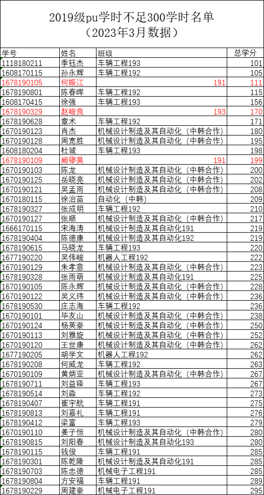 表1 2019级pu学时不足300学时名单(含2021级专升本学时不足100名单)