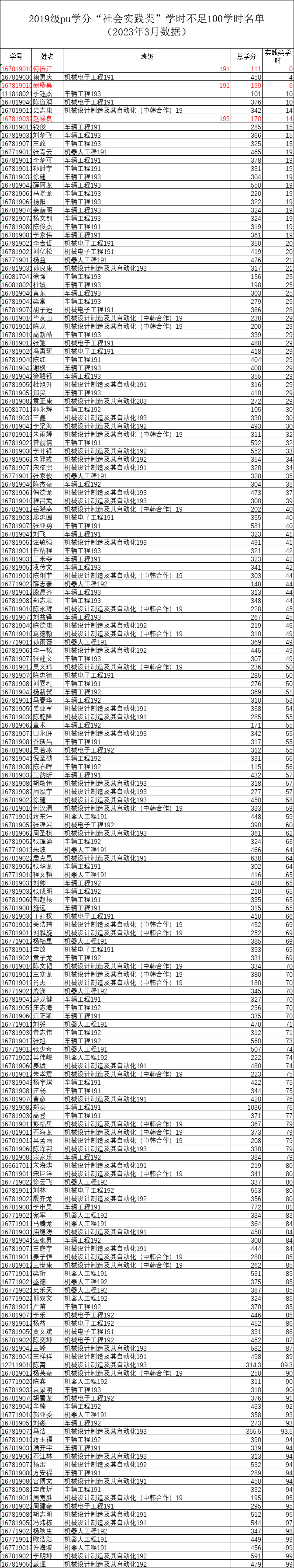 机械工程学院2022-2023-2学期二课堂学分(PU)未达标名单公示(2023届)