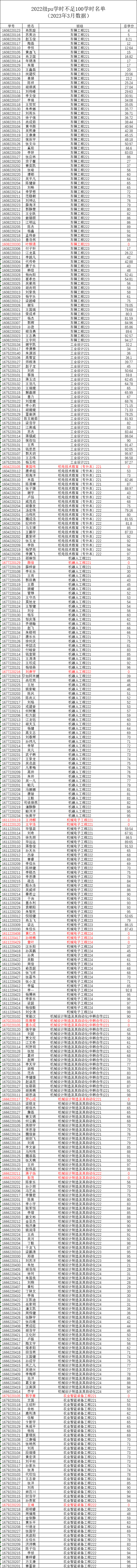 机械工程学院2022-2023-2学期二课堂学分(PU)未达标名单公示(2020级、2021级、2022级)