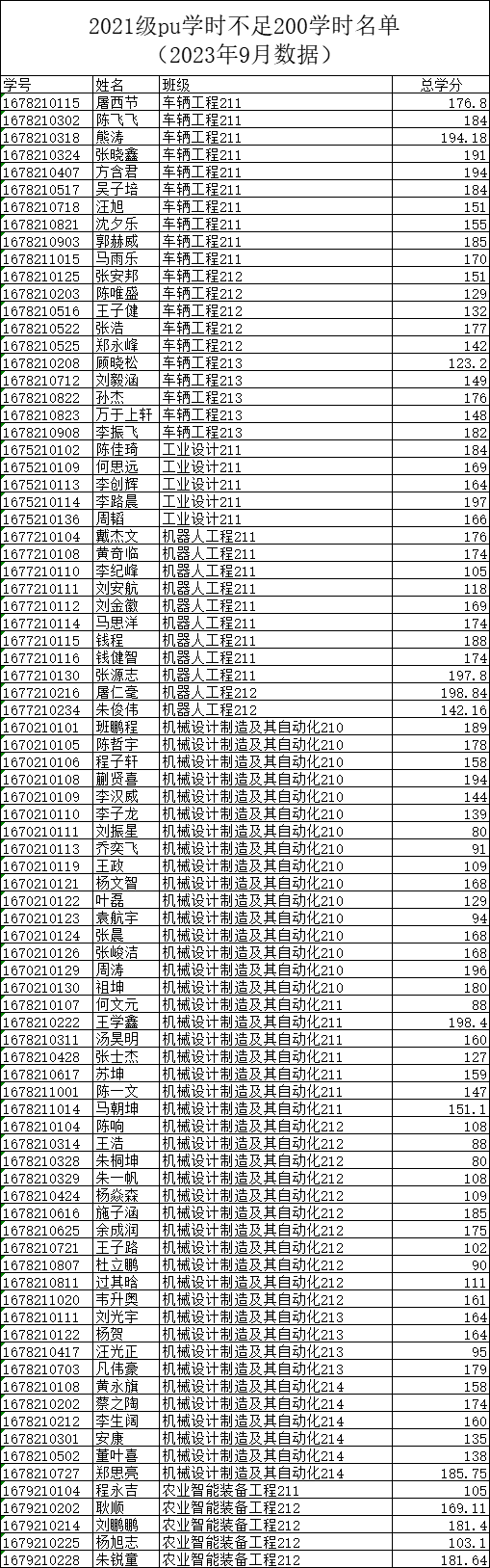 机械工程学院2023-2024-1学期二课堂学分(PU)未达标名单公示(2020级、2021级、2022级)
