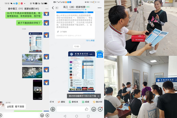 本次活动由我组成员负责,本次活动分为四个部分:一,联系本届高考生或者毕业班老师分享三亿网页版招生宣传资料电子档;二、我组成员各自联系以前的班主任,看望班主任并向班主任汇报自入大学以来的生活和成长;三、在砀山中学校园内进行现场宣传,包括海报的张贴、宣传折页的发放、为考生解疑答惑播放我校招生视频等;四、同我校负责来砀山中学招生的老师一道,在高招会上为前来的学生及家长解疑答惑,分享我们在安科学习和生活的日常。