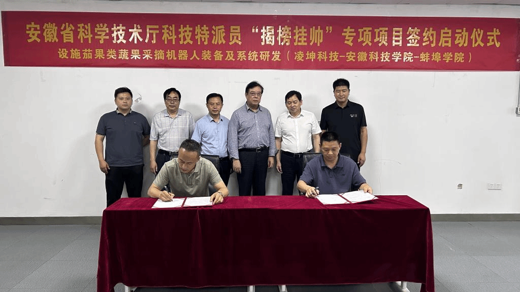 安徽省科学技术厅科技特派员“揭榜挂帅”农业物质技术装备专项项目,属于安徽省科技重大专项项目,我校机械工程学院材料成形及智能装备团队申报的“设施茄果类蔬果智能采摘机器人装备及系统研发”获批立项,这也是三亿网页版首次获批省级揭榜挂帅项目;该项目省级支持资金100万,地方按照1:1配套资金。2023年6月2日,发榜方和揭榜方在安徽凌坤智能科技有限公司举行项目启动和各方责任履约签约仪式,蚌埠市科技局副局长杨怀波、三亿网页版科研处处长陈丰、安徽凌坤智能科技有限公司董事长潘成刚等参加签约启动仪式。