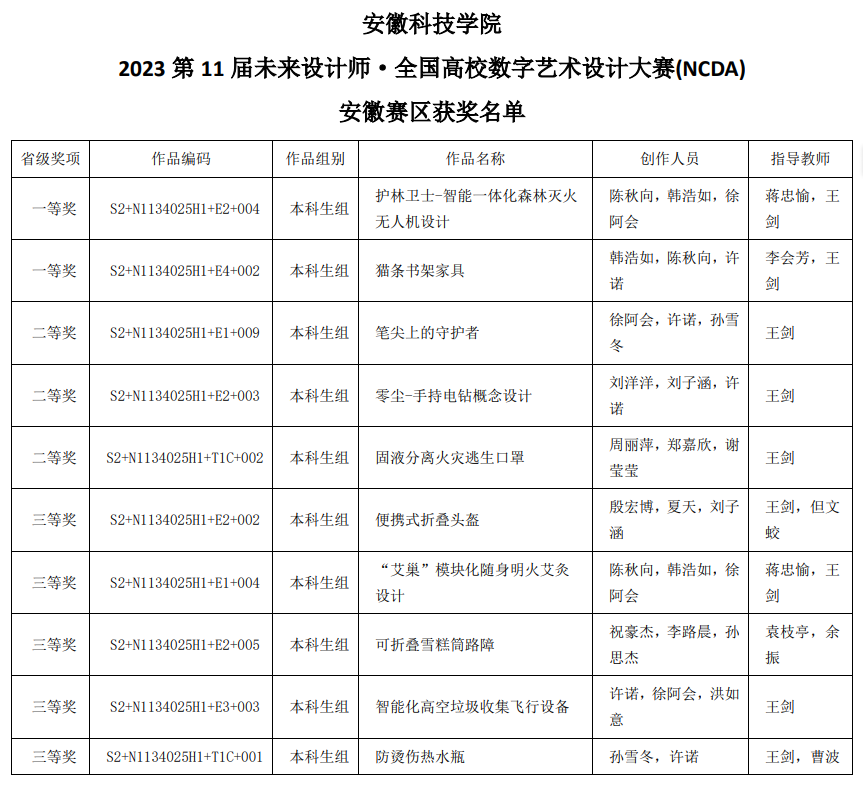 近日,第11届未来设计师·全国高校数字艺术设计大赛(NCDA省级赛获奖作品公布。经过烈竞争和评委们多轮评审,我校机械工程学院工业设计专业学子荣获安徽赛区一等奖2项、二等奖3项、三等奖5项。