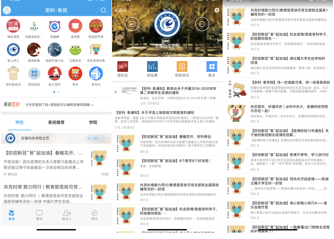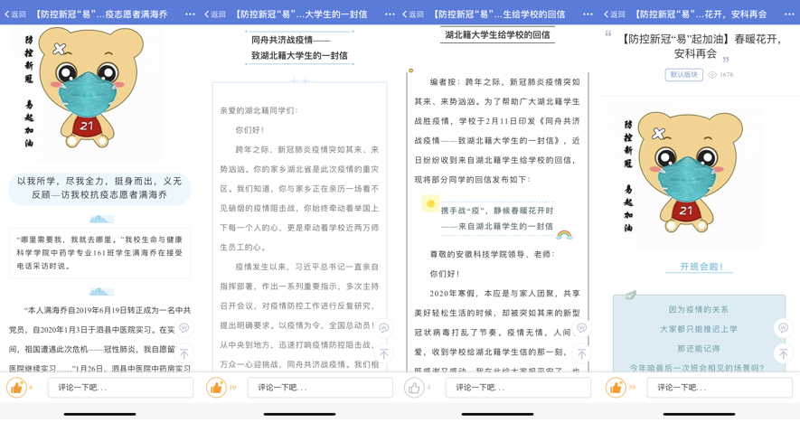 构建全方位的宣传体系,开设“防控新冠易起加油”版块,自1月25日起不间断推送各类疫情防控专题帖50余篇,介绍全国疫情防控形势,个人疫情防控知识,以及学校疫情防控工作部署安排,积极宣传抗疫一线的感人事迹。发起线上“我是安科学子—“易”起承诺”活动,承诺疫情期间科学防控,不传谣不信谣,学习预防并重,绝不提前返校。推送《三亿网页版致全体师生员工一封信》《同舟共济战疫情——致湖北籍大学生的一封信》,有效凝聚起众志成城、共克时艰的强大正能量。