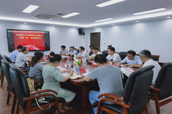 7月3日下午,蚌埠市人力资源和社会保障局“四进一促”进校园座谈会在我校龙湖校区综合楼四楼会议室召开。校党委委员、副校长黄远友出席会议并讲话。蚌埠市人力资源交流服务中心主任杨桓及丰原集团、凯盛工程技术有限公司、神舟机械等企业人力资源部负责人出席会议。我校化学与材料工程学院、财经学院、管理学院、建筑学院、网络与信息工程学院等二级学院党总支书记及创新创业教育学院教师代表参加了座谈。会议由招生与就业工作处处长黄树桥主持。