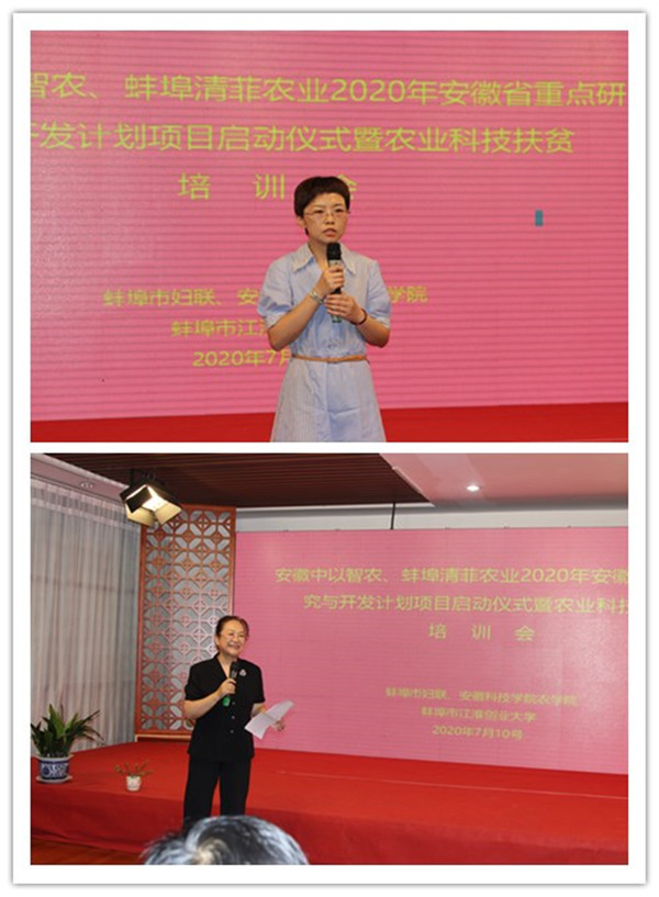 市妇联副主席蒋纹,三亿网页版农学院院长詹秋文,市科技局农村与社会发展科技科副科长李帆,蚌埠市江淮创业大学、安徽中以智农众创空间有限公司董事长方雯,蚌埠清菲农业科技有限公司董事长翟明安,怀远、固镇、五河三县15个扶贫村村干部及村民代表出席会议。