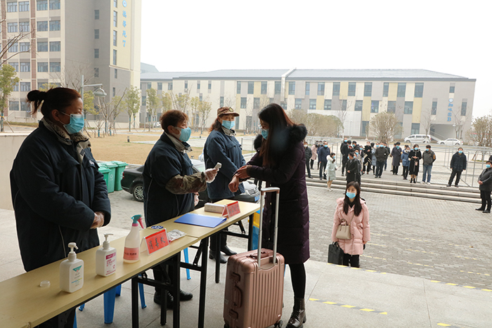 本次演练按照上级和学校要求,重点模拟演练学生返校、宿舍生活和发热人员应急处置。演练现场,返校学生在校门口下车,在保安的引导下,保持1.5米间隔排队,扫码并查验健康码绿码,经过鞋底消毒、行李消毒、测量体温、更换旧口罩、手部消毒、发放并更换新口罩后,步行有序进入学校,分别在各二级学院报到区查验易班中的“返校码”完成进校流程。