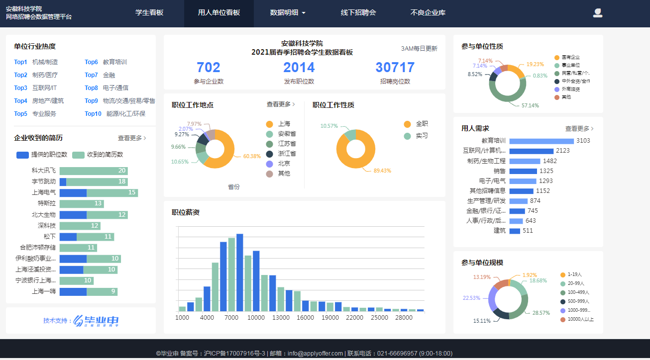 根据2018-2020三个年度毕业生就业质量报告,我校毕业生省外就业主要面向长三角核心地区,其中,在沪就业比例一直在10%以上。毕业生去向就是就业工作取向,学校加强长三角区域就业布局,作为毕业生就业工作的重点布局领域。2020年下半年疫情缓解以来,学校积极与上海学生事务中心联络,继续拓展合作领域,截至2021届毕业生离校时,先后举办“多方联动、聚力就业”上海市2021届高校毕业生春季“安科之生”专场招聘会、“安科之生”春季就业冲刺月(互联网专场)、高校毕业生就业促进周2021年“安科之生”专场、毕业季“安科之生”专场、长三角招聘会三亿网页版“海聚英才”2021年离校未就业毕业生专场云聘会、长三角“安科之生”2021届毕业生离校未就业专场,6个场次共有36345次访问记录,投递简历2033份,702家用人单位共发布5007个职位,73865个岗位,涉及机械制造、制药医疗、互联网等诸多行业领域,涵盖了数字经济、电子信息、新材料等重点发展产业,为毕业生融入长三角区域就业提供了广阔的双选平台。(特约通讯员:司萍 审核:施培智 编辑:张威)