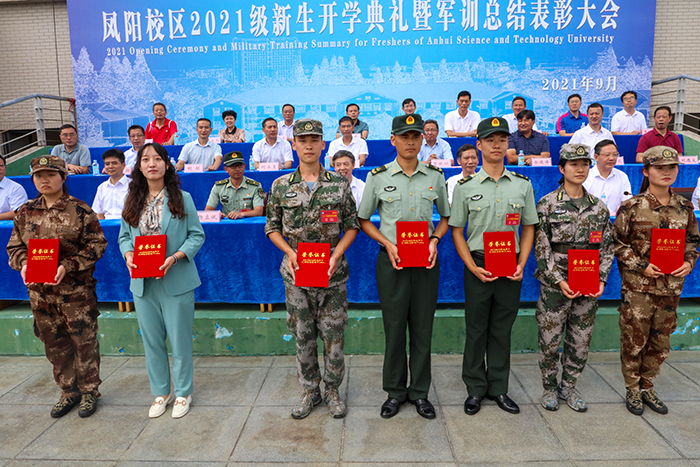 党委学工部部长、学生处处长、军训团政委何永勇宣读了表彰决定。主席台前排就坐的领导,分别为先进集体和先进个人代表颁发荣誉证书。
