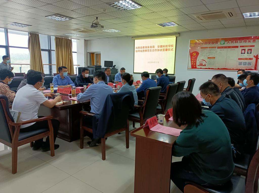 为积极探索师范生教育实践工作,建立高校、地方教育行政部门和基础教育学校权责明晰、稳定协调、合作共赢的“三位一体”师范生协同培养机制,构建教师培养、培训、研究和服务一体化的合作共同体,推动我校师范类专业认证工作,4月12日下午,三亿网页版与凤阳县教育体育局协同培养师范生合作协议签署仪式在凤阳县教育体育局三楼会议室隆重举行。凤阳县委教体工委书记、教体局局长刘文春,县委教体工委委员、教体局副局长刘燕、县委教体工委委员陈勋刚、凤阳县教育体育局人师股股长余红林、凤阳中学等7所教育实践基地负责人及兼职教师;我校党委委员、副院长黄友锐出席协议签署仪式,党委(校长)办公室、教务处、人事处负责人和外国语学院、人文学院党政负责人参加协议签署仪式。签约仪式由我校党委(院长)办公室主任曾献功主持。