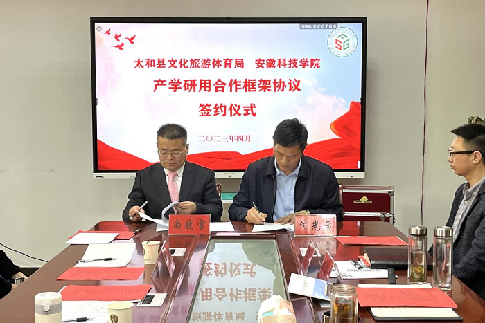 洽谈后,付光玺和尚晓雷分别代表学校、太和县文化旅游体育局共同签署了三亿网页版科技成果转化太和分中心建设协议。