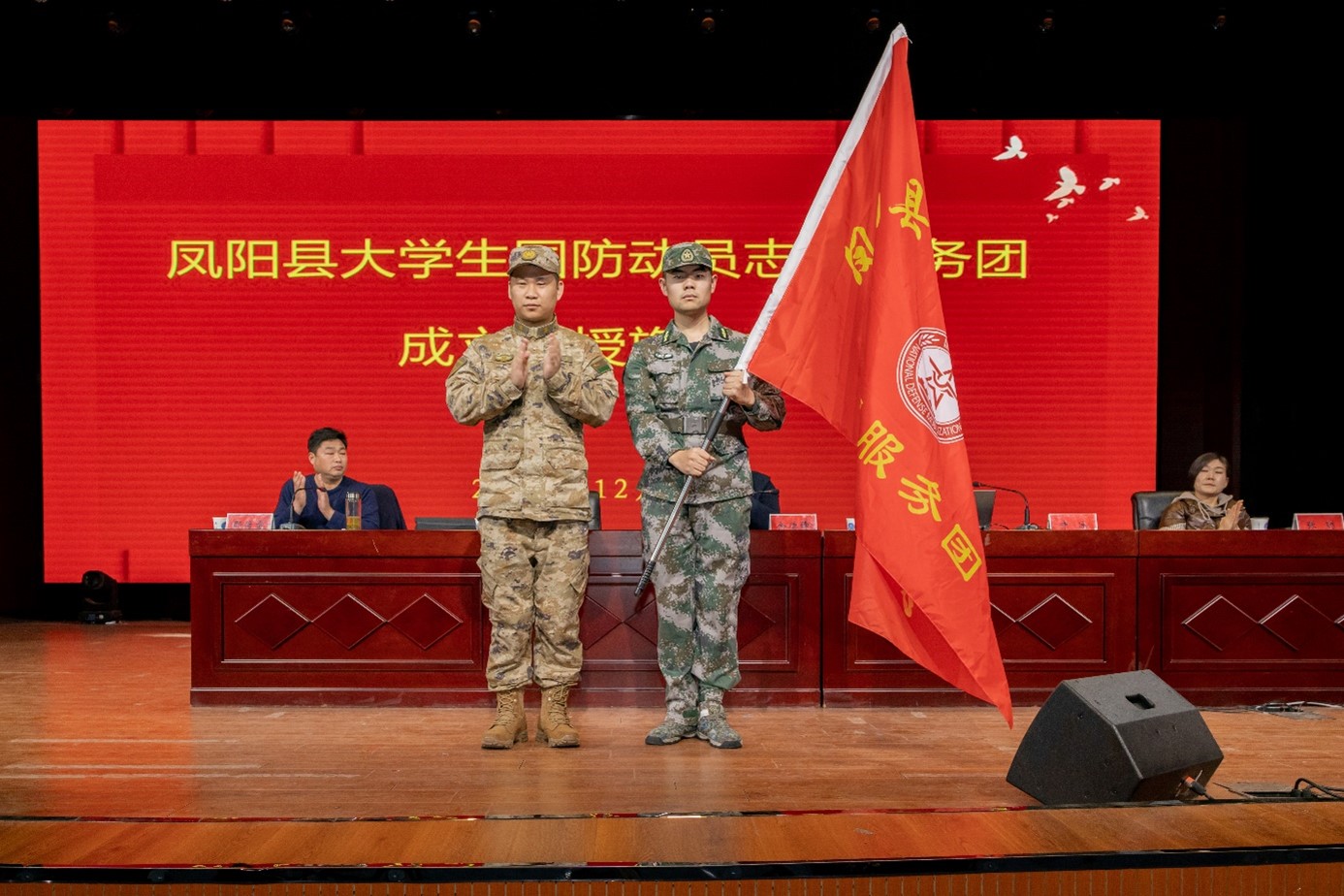报告会前举行了凤阳县大学生国防动员志愿者服务团成立仪式,凤阳县人武部政工科教练员李明为服务团授旗,我校退役大学生李永凯担任副团长。