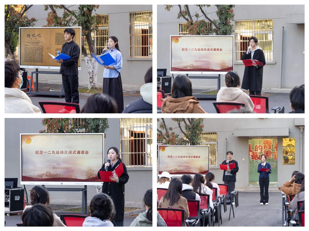 诵读会以一二·九运动发展为脉络,深刻剖析了一二·九运动的起因、经过和历史意义,用鲜活的历史事例和场景再现,引导青年学子感同身受,在学习党史的过程中主动融入。《逃亡》《演讲》《游行》等情景剧的串联,让现场的观众无比动容,《告全国民众书》《热风·随感录四十一》等情景诵读,高扬以爱国主义为核心的民族精神,增加青年学子对故土家园、骨肉同胞和灿烂文化深深的眷恋与热爱,感受到了中华民族捍卫主权和领土的威武不屈,自强奋进、生生不息。《这一幕》《战河》《爱国之路》等现代诗歌朗诵展现了安科学子学史明理、学史增信、学史崇德、学史力行的青春誓言。校团委副书记李刚领学《中国共产党简史》相关内容,食品工程学院团委副书记吴玘朗诵的《青春中国》将诵读会气氛推向高潮。