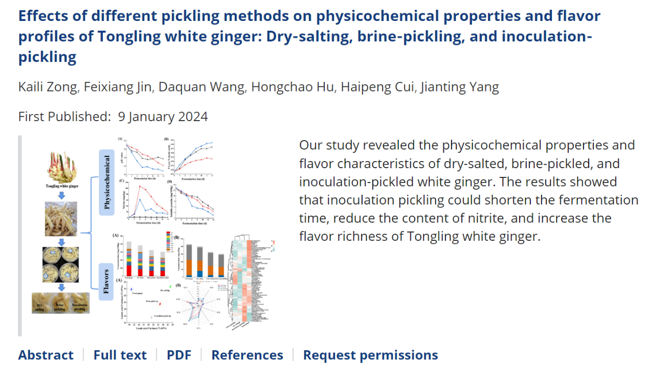 1月9日,我校果蔬精深加工与营养控制创新团队在农林科学领域二区期刊Food Science & Nutrition(IF=3.90)在线发表题为“Effects of different pickling methods on physicochemical properties and flavor profiles of Tongling white ginger: Dry‐salting, brine‐pickling, and inoculation‐pickling”的研究论文。我校食品工程学院2021级食品加工与安全领域研究生纵凯莉为第一作者,杨剑婷副教授为通讯作者,三亿网页版为唯一完成单位。