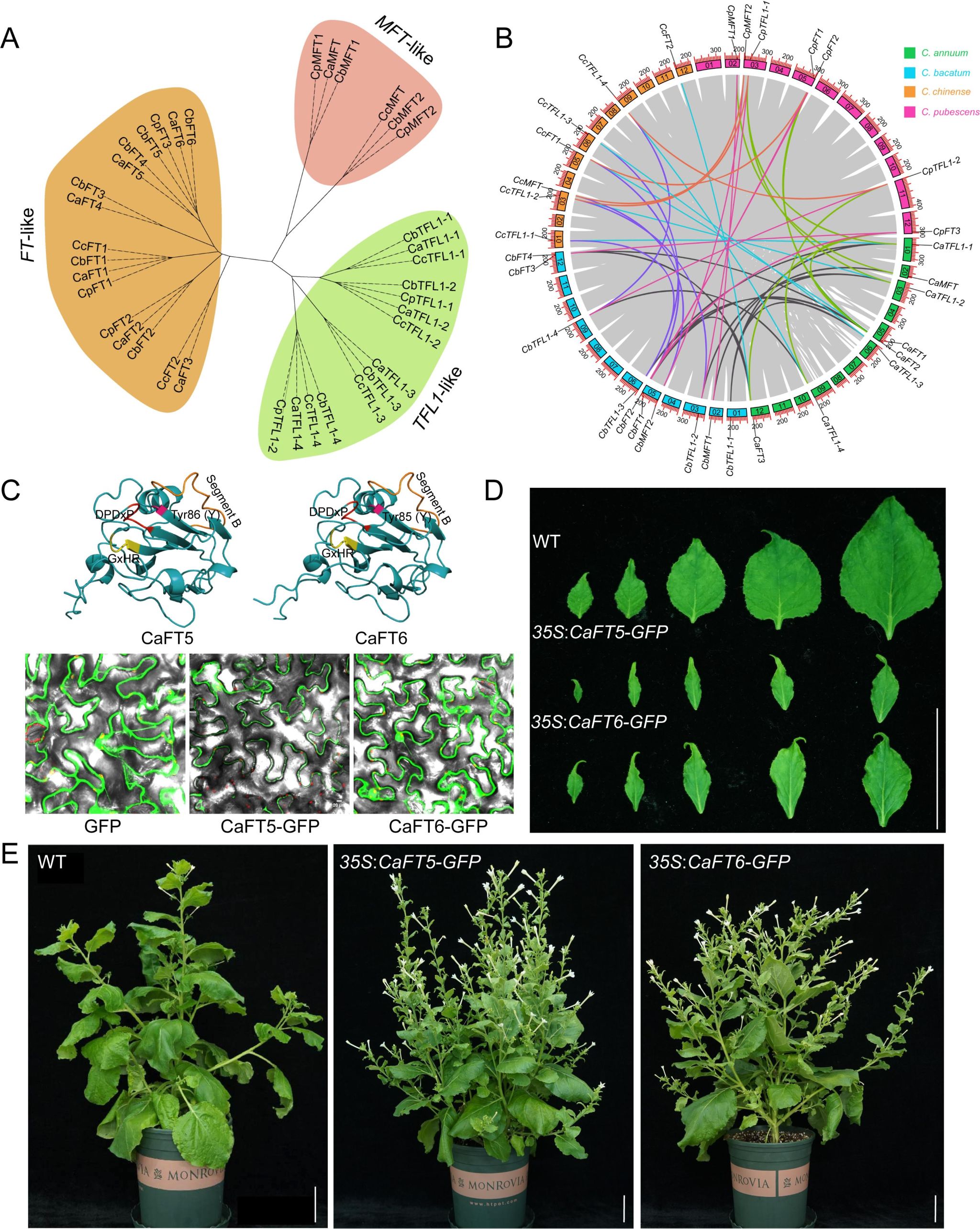 该研究对一年生辣椒、浆果辣椒、茸毛辣椒和中华辣椒4种辣椒的PEBP基因成员进行全基因组综合分析,共鉴定出37个PEBP基因,其中一年生辣椒11个、浆果辣椒12个、中华辣椒7个、茸毛辣椒7个,系统进化分析将其分为FT(17个)、TFL1(14个)和MFT(6个)共3个亚家族。本研究不仅拓宽了茄科植物成花素-反花素系统的研究,为进一步利用该组份在辣椒中进行遗传改良奠定了理论基础,具有重要的应用价值。