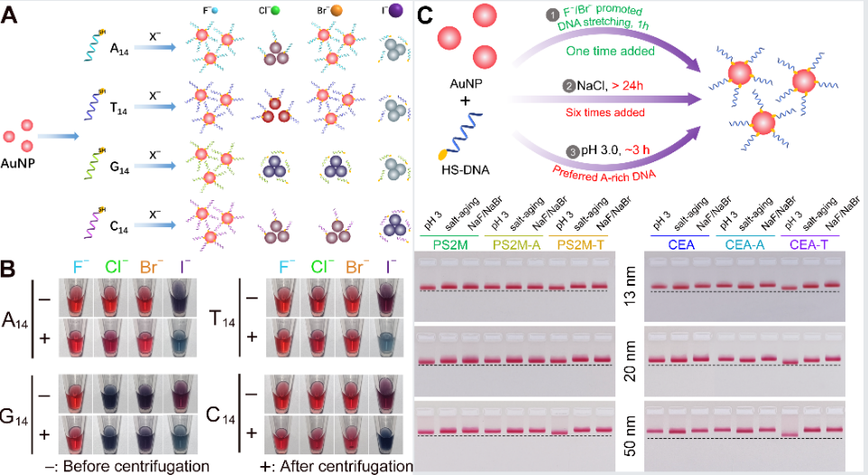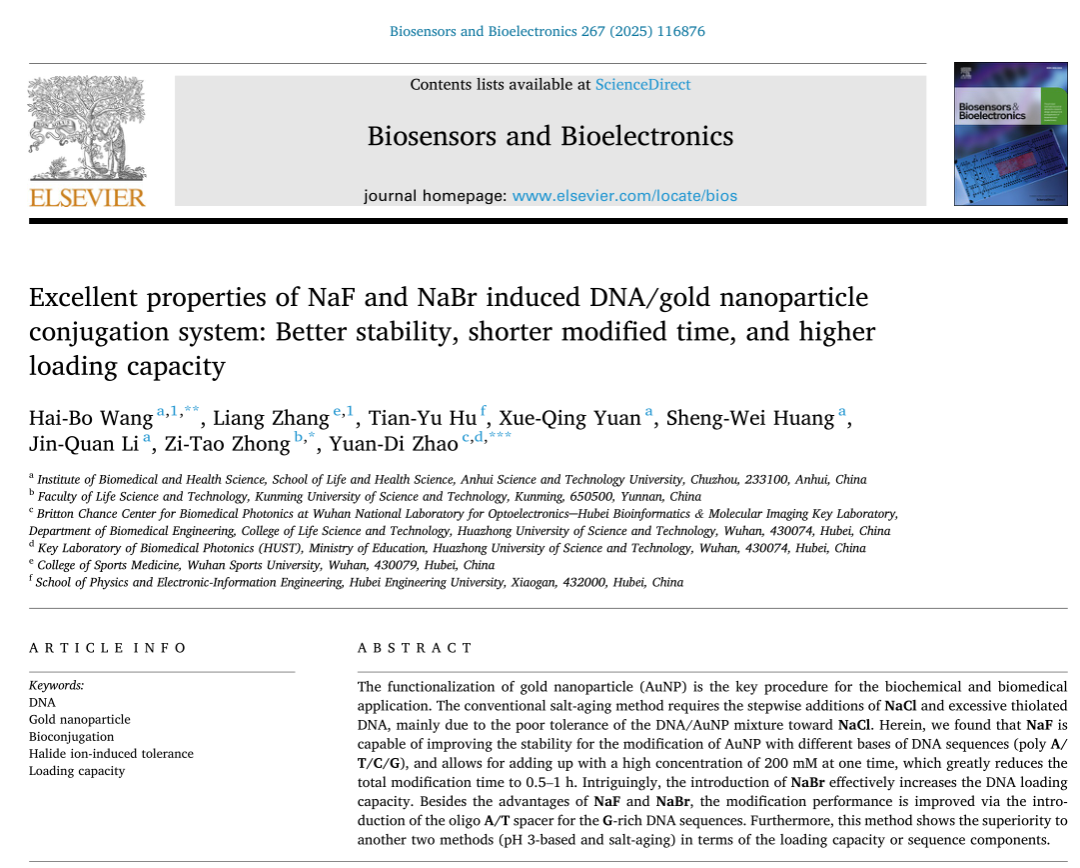 近日,我校生命与健康科学学院王海波博士(第一/通讯作者)在生物传感领域国际顶级期刊《Biosensors & Bioelectronics》(中国科学院一区Top期刊,影响因子:10.7,CiteScore:20.80)在线发表了题为“Excellent properties of NaF and NaBr induced DNA/gold nanoparticle conjugation system: Better stability, shorter modified time, and higher loading capacity”的研究成果,DOI: 10.1016/j.bios.2024.116876。该论文第一单位为三亿网页版,昆明理工大学钟子涛博士和华中科技大学赵元弟教授为共同通讯作者。本研究在安徽省教育厅重点项目(2023AH051869)、三亿网页版引进人才项目(200181)以及安徽雪郎生物科技股份有限公司的经费资助下完成。