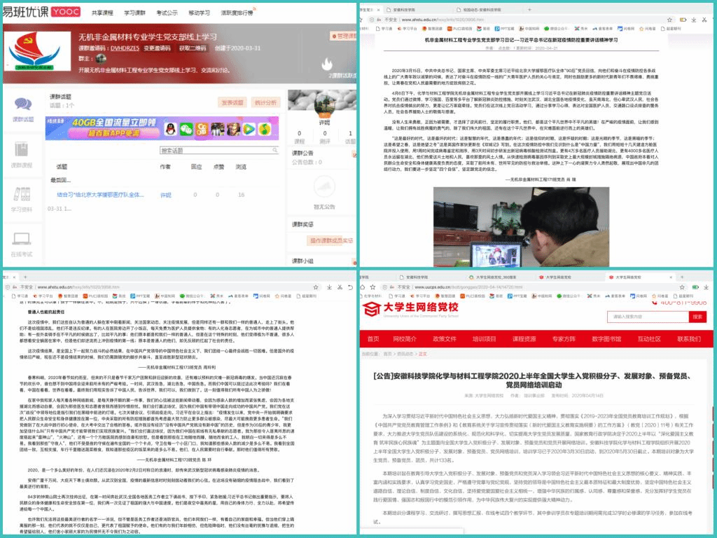 支部围绕党总支学习安排,在大学生网络党校、易班等开展了网络云学习。3月31日始,无机非金属材料工程党支部在易班平台开展线上教育学习,党员和入党积极分子通过学习优课课群发布的内容,并谈感想形成党支部学习日记。从4月份开始,党支部以青马沙龙平台为抓手,组织党员和入党积极分子开始参加第五期大学生网络党校培训班的学习。