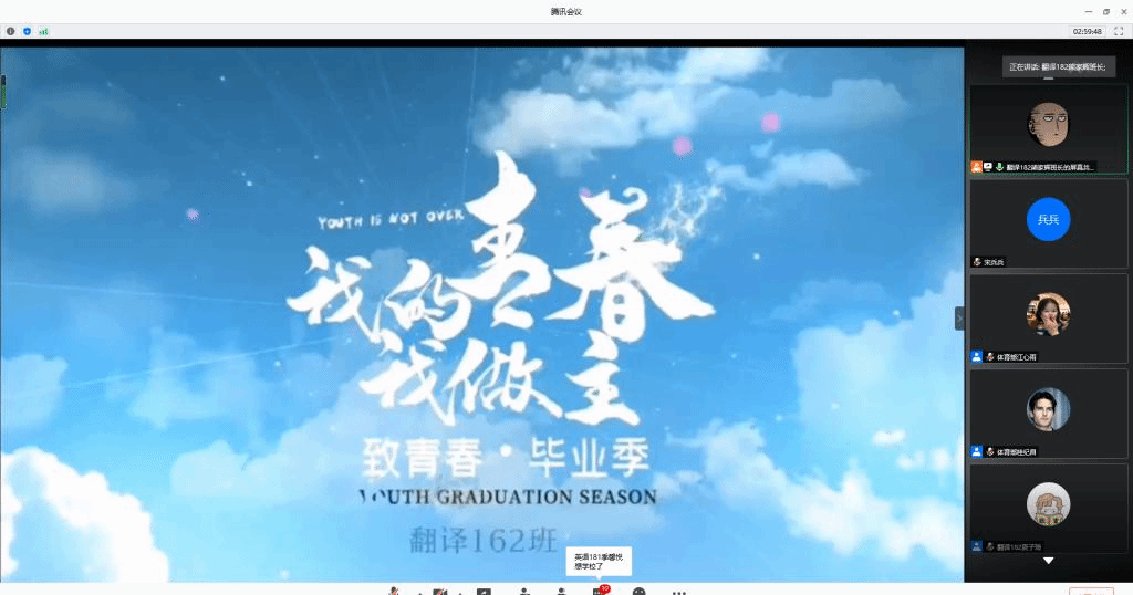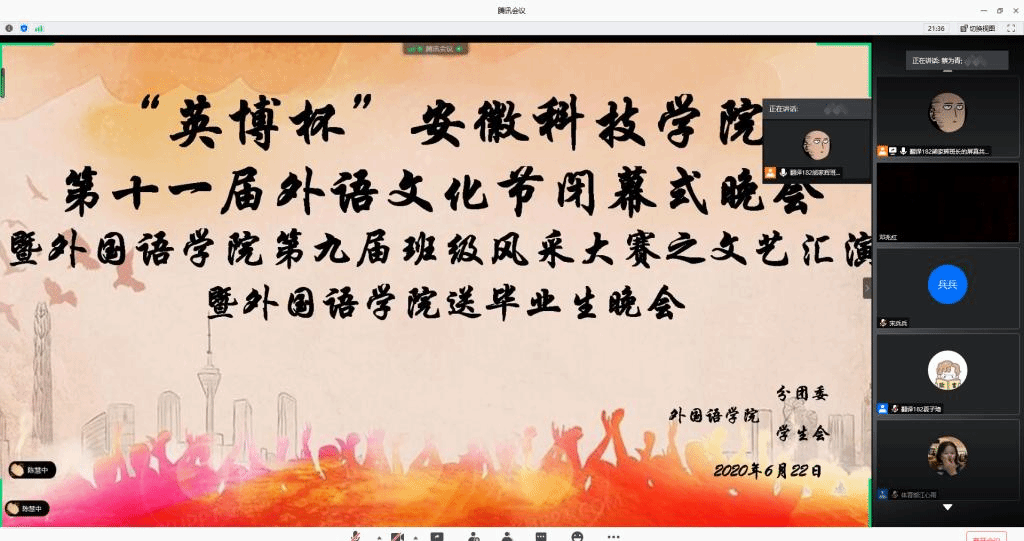 6月22日晚,外国语学院在腾讯会议上举行了“英博杯”三亿网页版第十一届外语文化节闭幕式晚会暨第九届班级风采大赛文艺汇演暨送毕业生晚会。外国语学院院长陈德用、党总支书记蔡为青、副院长刘萍及师生代表参加。此外,班级风采大赛文艺汇演邀请动物科学学院学生会主席孙静、资源与环境学院学生会主席吴柳莹、人文学院学生会主席徐鹏飞,外国语学院六届二任学生会主席杨妍,英语162班班长张寻、外国语学院六届一任学生会文艺部部长宫思远、翻译161班团支书陈慧仁7名同学担任评委,晚会由英语182班刘珍珍和翻译182班胡玉辰2位同学主持。