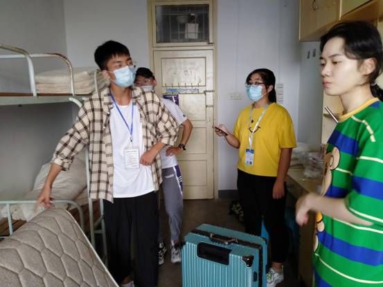 学院老师也加入迎新队伍,在报道现场帮助新生解决困难,同时亲力亲为帮新生搬运行李,与新生进行友好的交谈。