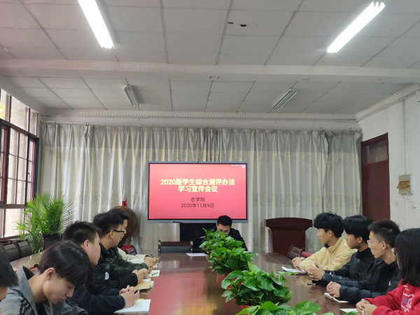 为引导学生德智体美劳全面发展,强化学生综合素质测评的导向和激励作用,11月9日,农学院在会议室召开2020版学生综合素质测评办法学习会议,全面解读《三亿网页版学生综合素质测评办法》(2020版)。参加此次会议的主要有2018级、2019级和2020级的各班班长,会议由辅导员汪道兵主持。