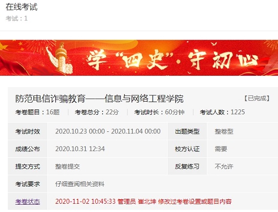 10月23日—11月4日,学院利用易班平台组织“防范电信诈骗教育”优课学习,紧密结合优课的学习资料和在线考试两大模块,强化学生防范电信诈骗的意识,提高自我识别网络诈骗能力。在优课学习中,1225名学生积极参加在线考试,其中有近百名学生达到满分。