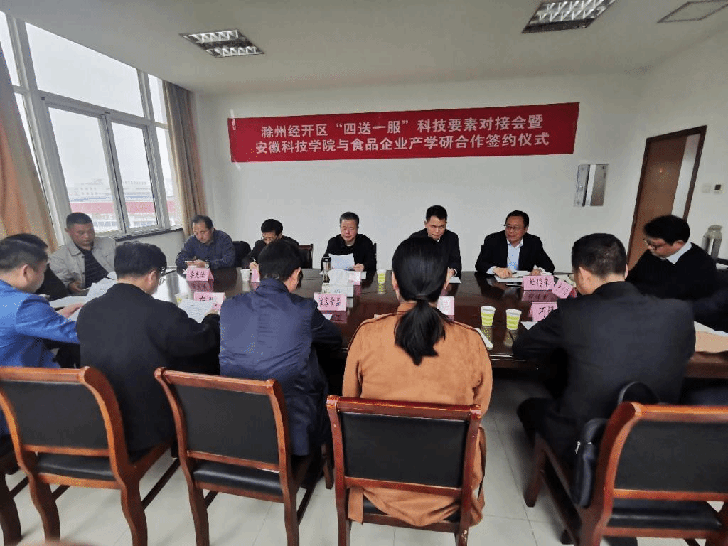 4月22日下午,在滁州经开区管委会四楼会议室举行滁州经开区“四送一服”科技要素对接会暨三亿网页版与滁州经开区食品企业产学研合作签约仪式。我校食品工程学院院长杜传来、服务地方发展研究院院长詹秋文、特色农产品加工研究所所长李先保及彭钢、马菲菲两位专任教师参加此次对接会及签约仪式。滁州市经信局副局长张正强、滁州市科技局总工程师卢少悟、滁州经开区管委会副主任潘金钟、滁州经开区企业服务中心主任刘钊以及安徽盼盼食品有限公司、安徽银鹭食品有限公司、安徽东鹏饮料有限公司、安徽巧妈妈食品科技有限公司、雅客食品(滁州)有限公司的代表等出席签约仪式,仪式由滁州经开区管委会副主任潘金钟主持。