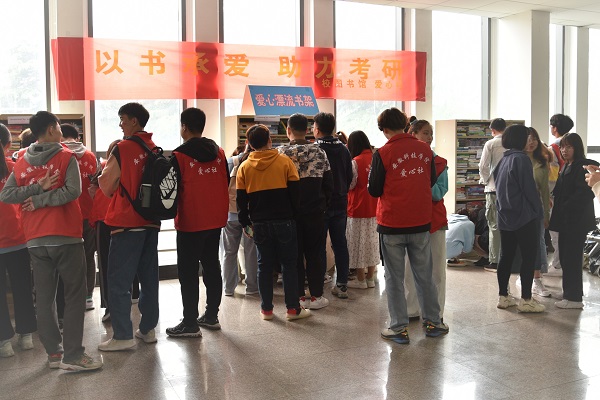 4月24日上午,图书馆联合校爱心社在凤阳校区图书馆2楼休闲平台共同开展了以“以书承爱,助力考研”为主旨的“2021年爱心漂流书架”活动启动仪式。