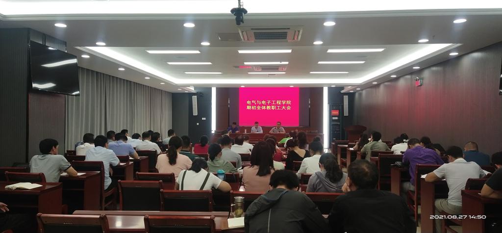 8月27日下午,电气与电子工程学院在综合信息中心西辅楼111报告厅召开期初全体教职工大会。学院党政领导和全体教职工参加了会议,会议由党委副书记、副院长(主持工作)夏显明主持。