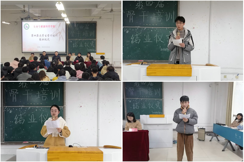 12月5日下午,生命与健康科学学院在新知楼B304教室举行第四届大学生骨干培训班结业仪式。学院党委书记詹学文、党委副书记彭丽萍、党政办公室主任王传林、团委副书记姜毅、专职辅导员孙玉楼及专职辅导员张迪出席仪式,21级各班级班委、学生会21级部分实习生共计170余人参加会议。会议由张迪主持。