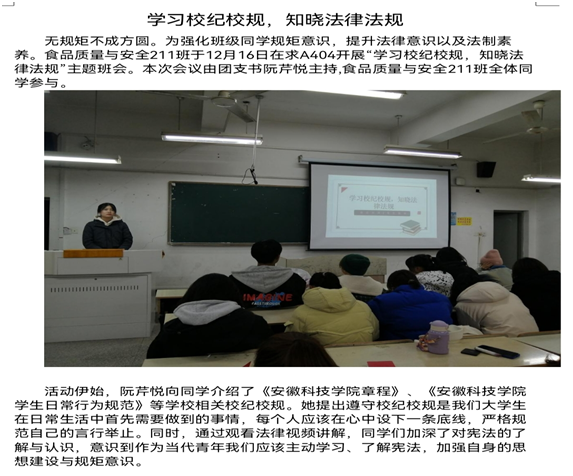 为进一步加强法治宣传教育,贯彻落实学校要求,各班级组织学生登录普法网,认真学习宪法知识,深入学习习近平新时代中国特色社会主义思想,进一步增强法治意识,坚持爱党爱国爱社会主义高度统一。同时,按照要求,各班级组织开展了学校规校纪和学法律知识主题班会,班级主要学生干部在班会上进一步宣讲《三亿网页版章程》《三亿网页版学生日常行为规范》《三亿网页版学生违纪处分办法》《普通高等学校学生管理规定》等校规校纪和法律知识,教育引导同学们掌握法律知识,做一名遵纪守法的好学生。