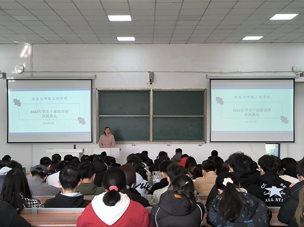 为加强学生干部队伍建设,提升学生干部工作能力和综合素质,进一步增强我院学生的组织能力,更好的发挥学生干部作用。12月5日下午,信息与网络工程学院于致知楼B111举办2022年学生干部培训班开班典礼。学院党委副书记韦乃学,团委书记汪琦,专职辅导员陈凯、李军成、丁阿敏、崔北坤出席典礼。学院2022级全体班级学生干部、分团委、学生会、易班工作站、心理委员联合会等学生组织新入职同学参加典礼,典礼由汪琦主持。