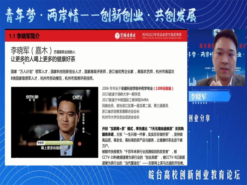 为了让大学生了解更多关于创业的知识,掌握专业本领,12月9日在新图书馆10楼会议室,由创新创业学院和国际交流与合作处共同举办的优秀校友创业经验分享会以腾讯会议形式顺利开展。本次分享会邀请到杭州艺福堂茶业有限公司董事长李晓军、安徽锦色秀华农业科技有限公司董事长刘建军、上海优仕饲料科技有限公司总经理柏家富校友作为主讲嘉宾。参加本次分享会的有创新创业学院院长赵伟峰、国际交流与合作处处长刘东楼、创新创业学院副院长高青海,大创项目团队成员、大学生创新创业孵化基地项目团队成员及其他对创业感兴趣的同学等共计100余人,会议由创新创业学院副院长高青海主持。