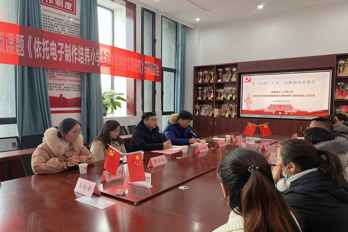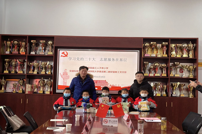 12月16日下午,外国语学院大学英语第二教研室教工党支部党员一行五人赴凤阳县工人子弟小学开展“学习党的二十大,志愿服务在基层”活动,活动受到该小学师生的热烈欢迎。