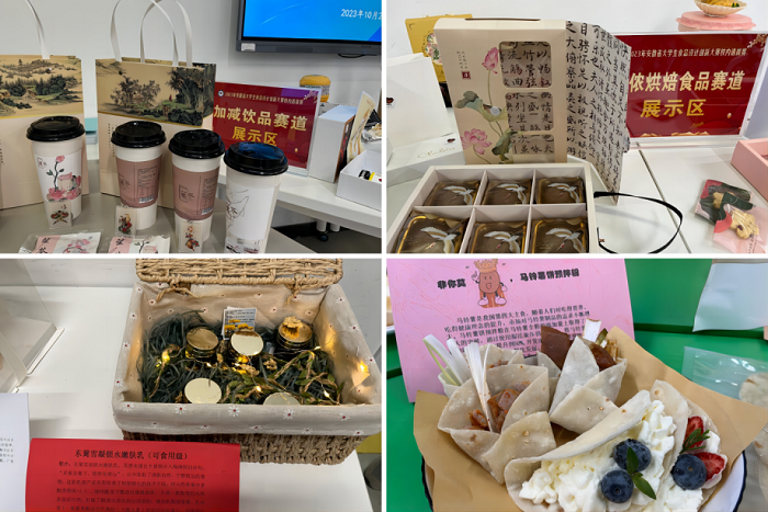 产品展示区域,“笙茶”、“谷满香”、“依糯相思”——低GI红豆汤圆、高粱司康系列、“无米成炊”、悬糊棘视——蛋糕卷等特色产品有序摆放,造型精美。前来参观的同学们纷纷表示:“产品创意太棒了!”“色、形、味俱佳”“学长学姐设计的包装好精美!”