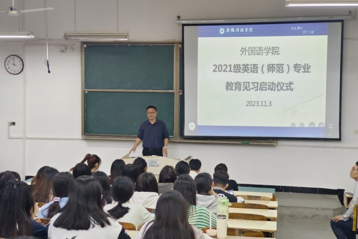 为确保外国语学院2021级英语(师范)专业学生教育见习工作顺利开展,11月3日下午,外国语学院在求知楼A101教室举行2021级英语(师范)专业教育见习启动大会。2021级英语(师范)专业全体同学参加本次会议。外国语学院党政领导和有关教师出席会议,会议由英语教研室副主任吴远青主持。